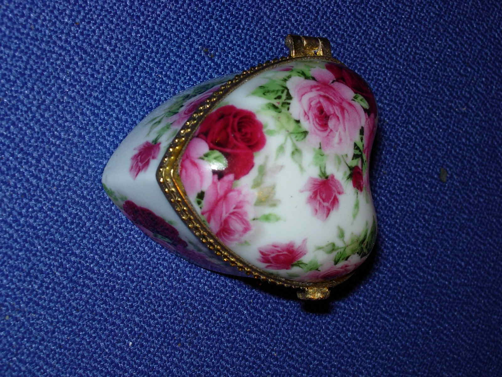 Heart shaped trinket pot decorated with pink roses presented in a blue satin lined box.